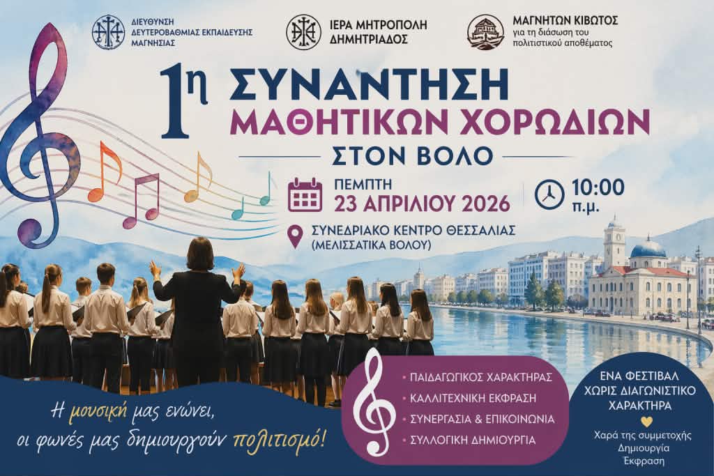 Ο Βόλος ετοιμάζεται να φιλοξενήσει μια ξεχωριστή πολιτιστική εκδήλωση, την πρώτη συνάντηση μαθητικών χορωδιών, η οποία με το όραμα των διοργανωτών ευελπιστεί να εδραιωθεί στο χάρτη των σημαντικών θεσμών. Η Διεύθυνση Δευτεροβάθμιας Εκπαίδευσης Μαγνησίας, έχοντας επικεφαλής την καινοτόμο πρωτοβουλία, συνεργάζεται στενά με τη διακεκριμένη Σύμβουλο Μουσικής, δρ. Σέβη Μαζέρα – Μάμαλη. Μαζί τους, στην προσπάθεια αυτή, βρίσκονται η Ιερά Μητρόπολη Δημητριάδος και ο φιλανθρωπικός οργανισμός «Μαγνήτων Κιβωτός», σηματοδοτώντας μια συνέργεια που ξεπερνά τα τυπικά πλαίσια και αγκαλιάζει την τέχνη και την εκπαίδευση. Η ημερομηνία που έχει οριστεί για αυτή τη γιορτή της μουσικής φέρει το συμβολικό βάρος της ανανέωσης: Κυριακή, 23 Απριλίου 2026. Ο χώρος που θα φιλοξενήσει τις πολυφωνικές εκδηλώσεις είναι το επιβλητικό Συνεδριακό Κέντρο Θεσσαλίας, ένα σημείο αναφοράς για την πόλη, έτοιμο να πλημμυρίσει από τις μελωδίες και τις φωνές των μαθητών.